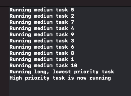 high qos Queue 내에 있는 Task는 접근할 수 있는 Thread가 1인 Semaphore로 공유자원을 관리합니다. 이 Semaphore는 low qos Queue 내에 있는 Task와 의존성이 있고, low qos Queue 내에 있는 Task가 끝날 때까지 high qos Queue 내에 있는 Task는 완료되지 못합니다.