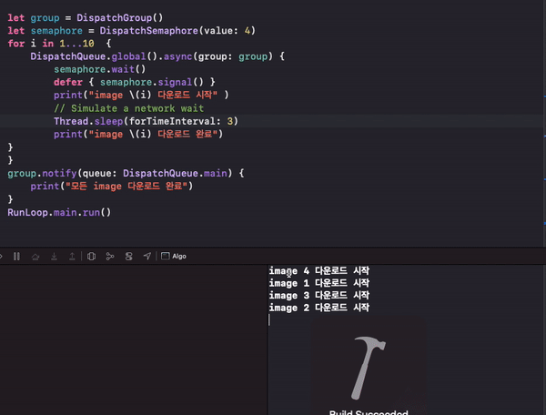 공유 자원에 대해 접근하는 Thread 수를 제한해야 할 때가 있습니다. 예를 들어 데이터를 다운로드하는 작업입니다. 다운로드 작업은 많은 리소스를 소모합니다. 따라서 어느 정도 제한을 줄 필요가 있습니다. 이때 사용할 수 있는 방법이 DispatchSemaphore입니다. 작업을 4개로 제한하고 싶을 때 Semaphore는 이렇게 생성할 수 있습니다.