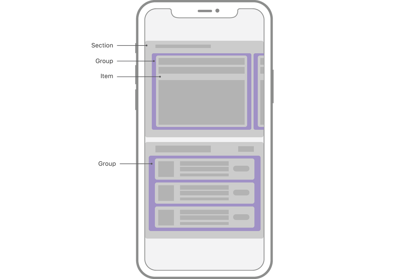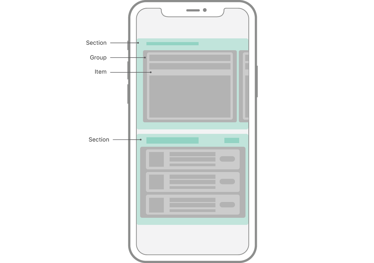 NSCollectionLayoutSection을 이용합니다. Group을 담는 Container입니다. Collection View는 하나 또는 여러 개의 Section을 가질 수 있습니다. Section은 Layout의 각각의 영역을 나타냅니다. Section은 NSCollectionLayoutGroup에 의해 결정됩니다. 각 Section은 고유의 배경, Header, Footer를 가질 수 있습니다.