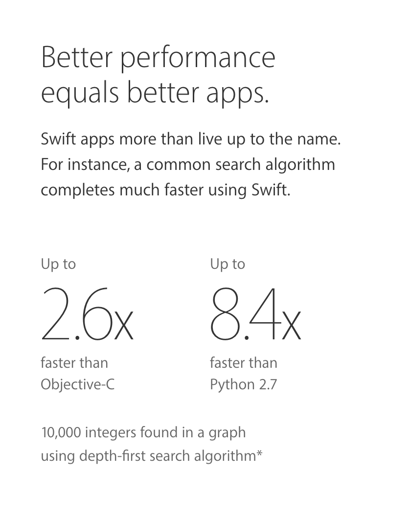 공식적으로 Objective-C 보단 2.6배 이상,Python 2.7보단 8.4배 빠르다고 합니다. 검증은 DFS로 했다고 하는데, Apple의 주장입니다.